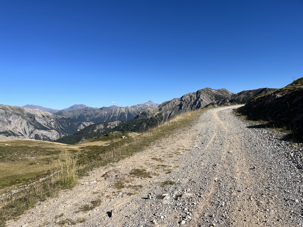Het bovenste deel, van de col de la Moutiere naar de route de Bonette, is behoorlijk goed gravel, je zou dat ook met de racefiets en 28 a 30mm banden kunnen doen als je daar comfortabel mee bent. De klim naar de Moutiere absoluut niet via deze kant. Ik moest ongeveer 2km lopen en was blij met schoenen waarmee dat goed te doen is. Water is er een km of 3 voordat je bij Bayasse bent, in Fours Saint Laurent te vinden, daarna bij mijn weten niet meer. Zorg dus dat je voldoende mee hebt hier.