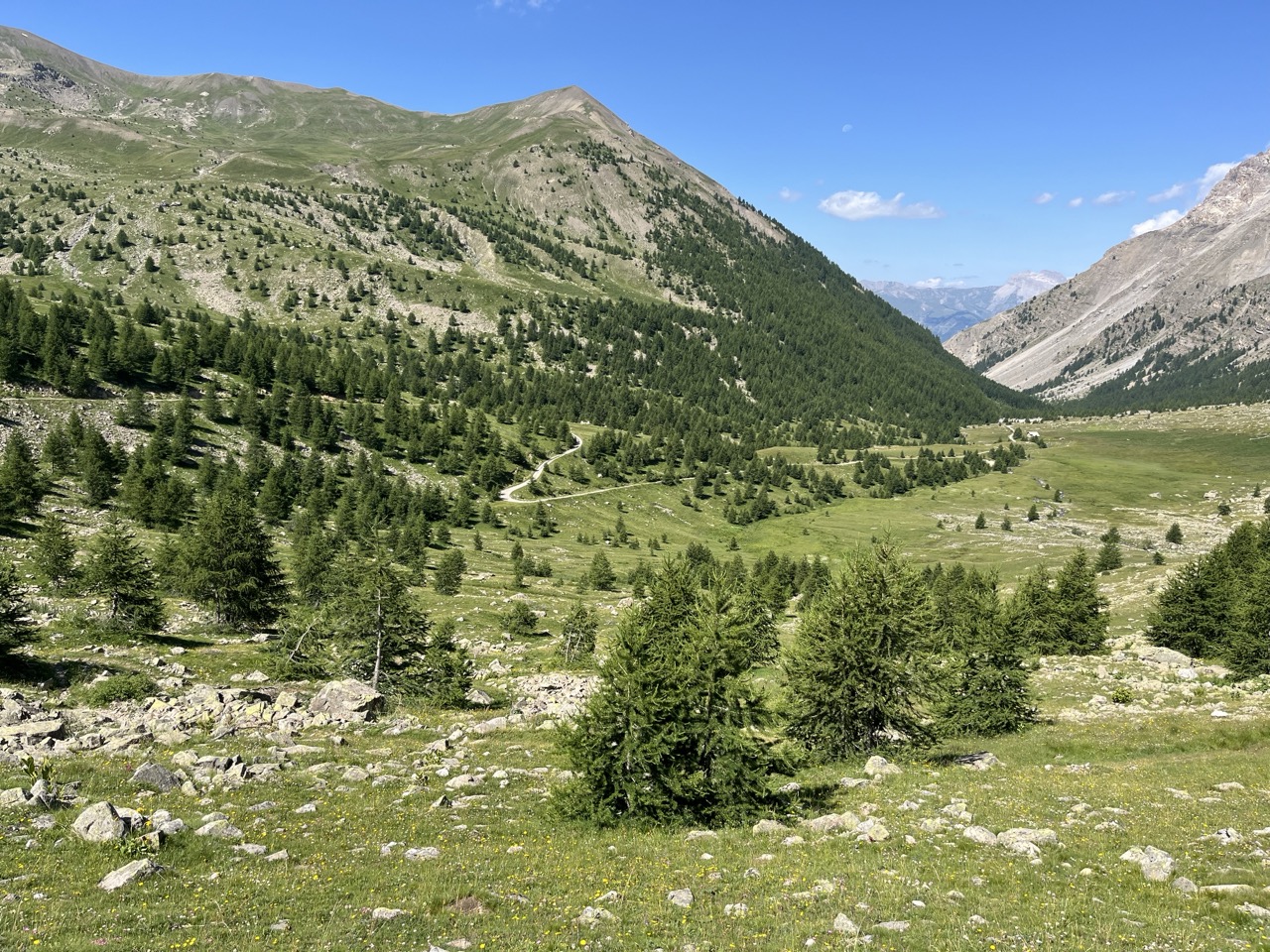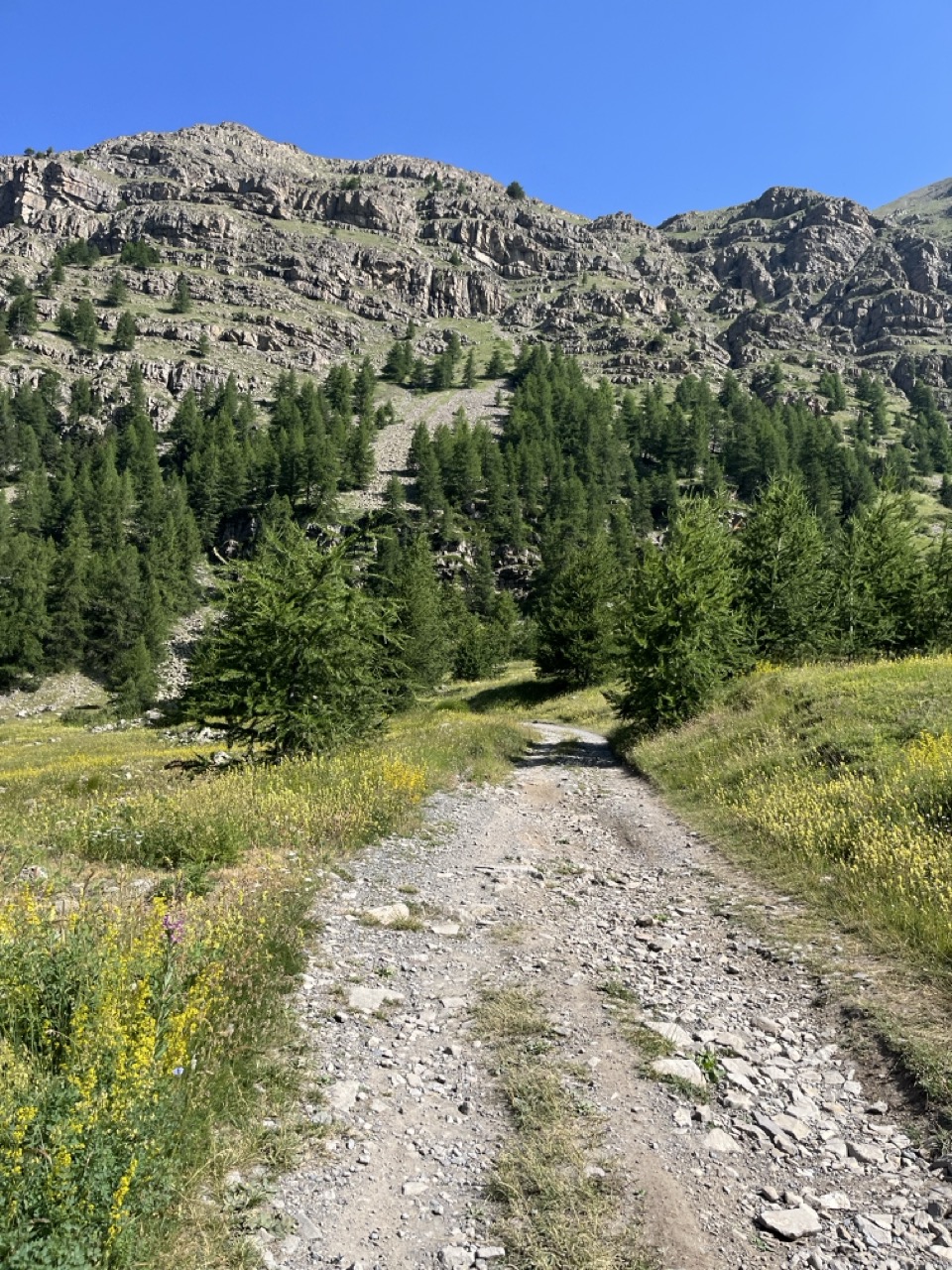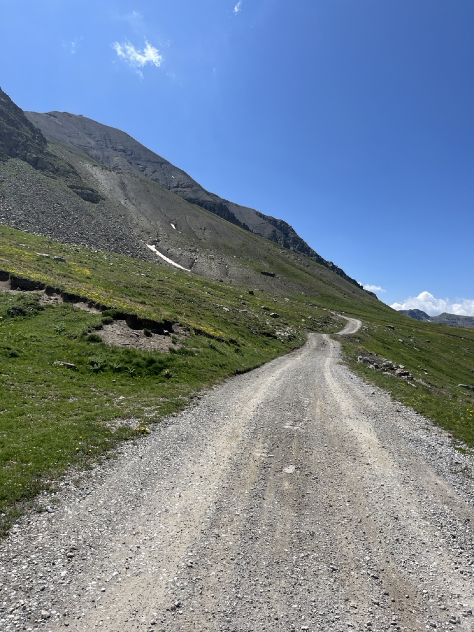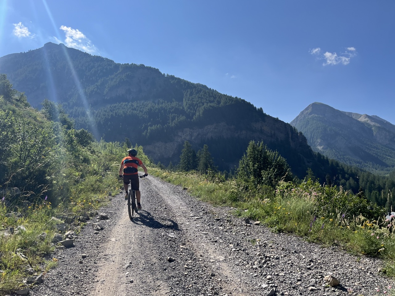 Hoewel er veel asfalt in de route zit, is het onverharde deel wel het meest tijdrovend. Vanaf de afslag in het gehucht Bayasse, is het flink stoempen geblazen richting de col de la Moutiere. De aanloop via de gemoedelijk percentages aan de weg richting de Cayolle is lekker in de ochtend, veel schaduw nog en prima opwarmterrein. Vanaf het moment dat het gravel wordt, komen we ook in meer open terrein met veel vliegen waardoor je je soms een rijdende koe voelt. De onderste 4 a 5 km gaan nog best 'makkelijk' maar vergen wel veel concentratie om de goede sporen te rijden. De passage op km 5 tot 7 na de afslag zijn echter te lastig (veel losse grote stenen en diepe sleuven na alle neerslag van de winter) en betekent maar 1 ding: lopen! Willem komt er op de MTB beter doorheen maar ploetert hier ook. Tot onze verbazing worden we nog ingehaald door 2 motoren en een 4x4.. blijkbaar mag je hier in de zomermaanden dus ook met gemotoriseerde middelen komen tot onze verbazing.