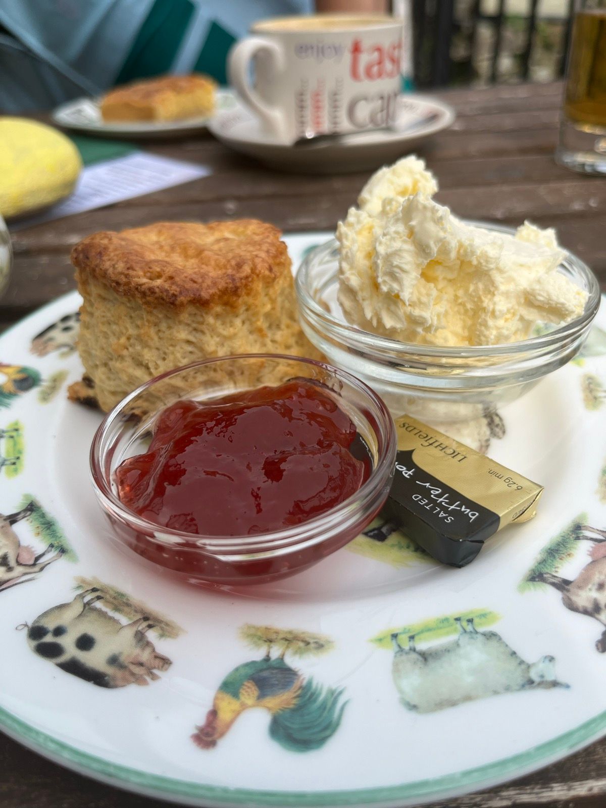 Ergens halverwege is er een pittoresk koffiezaakje dat zo recht uit een Instagram-feed lijkt te zijn gevallen, maar dan zonder de ironie. Scones met clotted cream. Thee. Een uitzicht op de moors. We nemen langer de tijd dan gepland, jammer van de vieze helling gelijk na de stop.