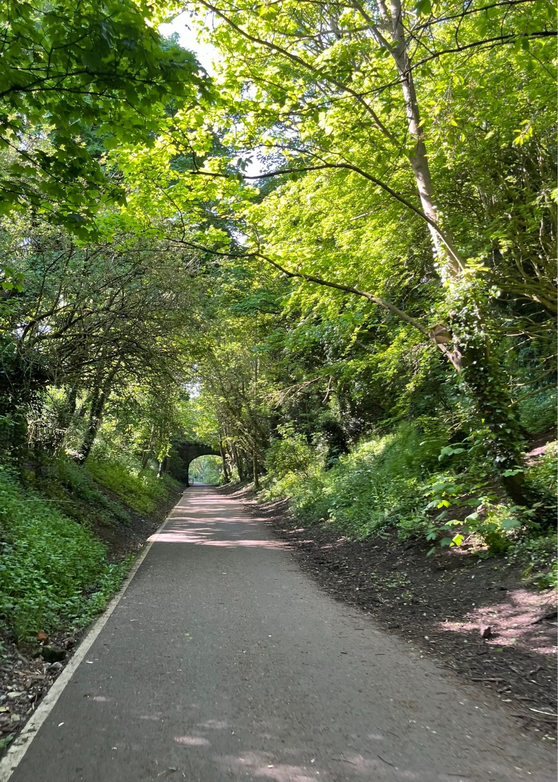 Oude spoorlijnen die zijn omgetoverd tot fietspaden vormen een groot deel van de route. Breed, stevig, soms met nog iets van de oorspronkelijke ballast eronder — je rijdt letterlijk over geschiedenis.